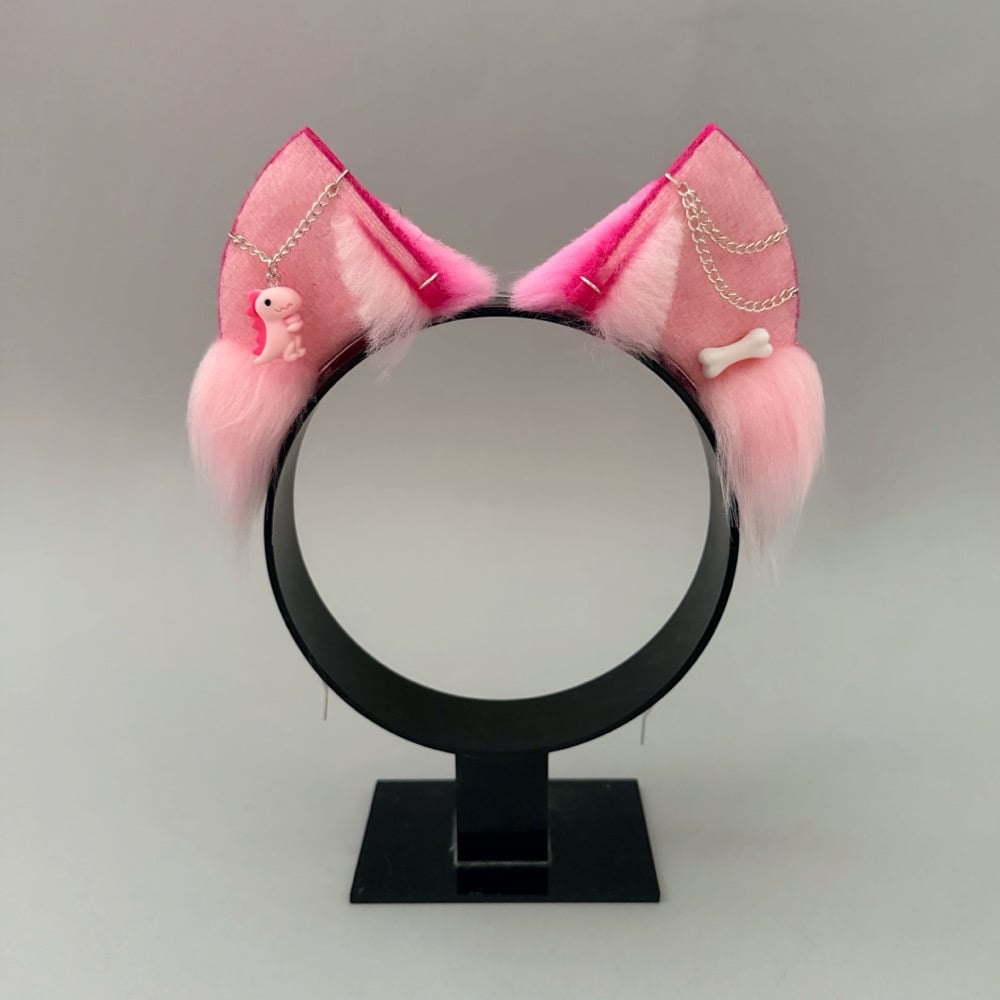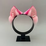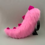 Pink fur curved Kitten shape tail with plush spike details, elastic attachment, firmly stuffed for wagability.