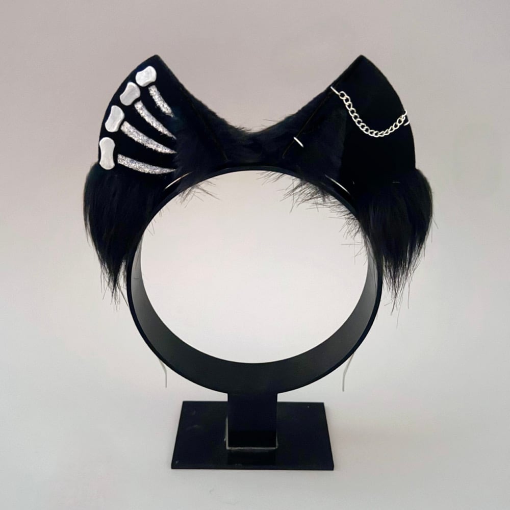 Black fur kitten shape tail with plush white bone detail, elastic attachment, firmly stuffed for wagability.
